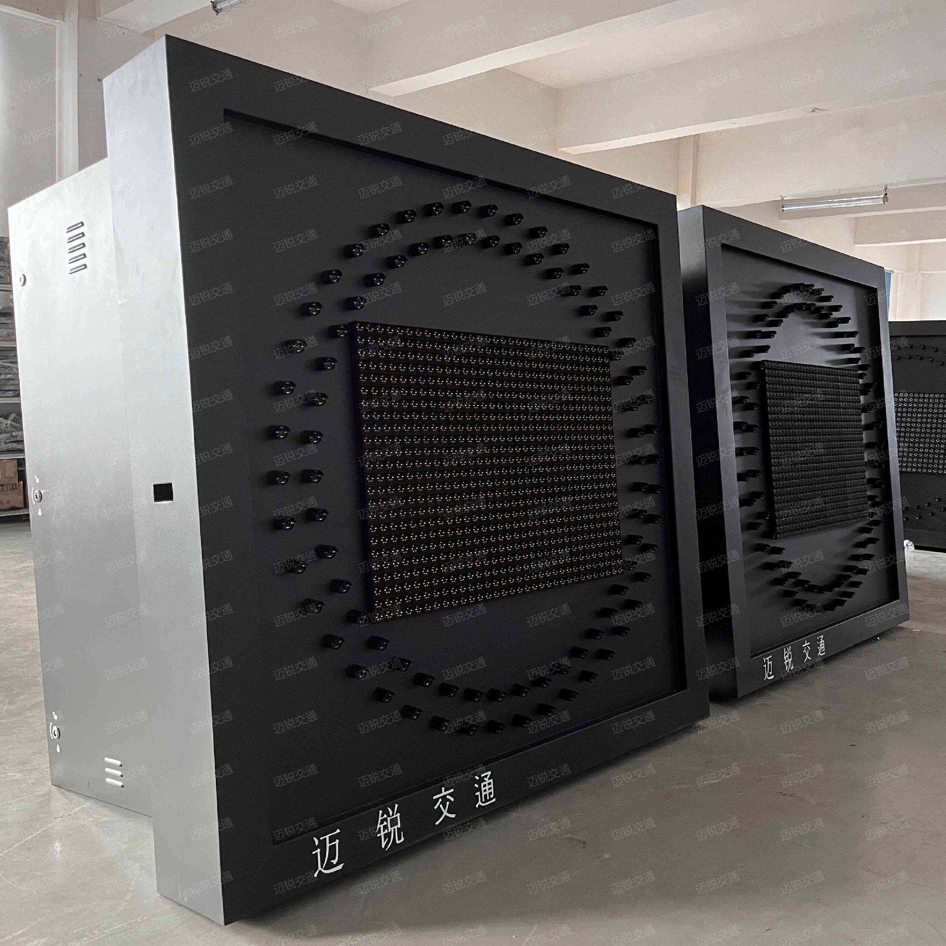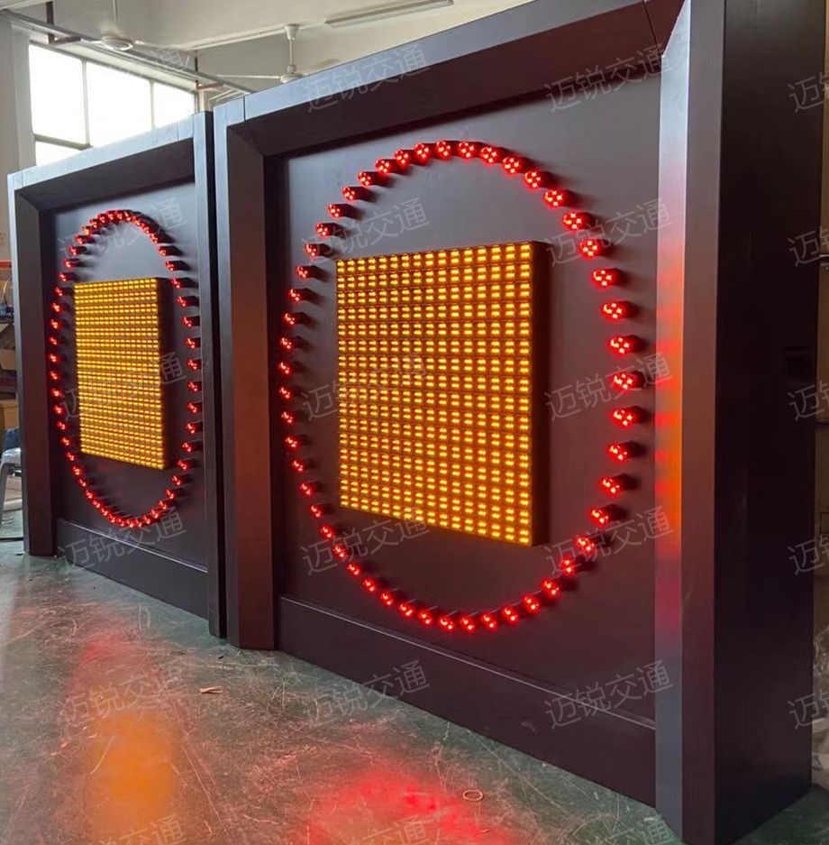2、LED可变限速标志总体外形为方形,该标志上的内容(外圈和中间的数字字符)均采用LED作为光源,数字部分采用LED像素筒拼接;可变信息标志能动态显示车辆限速值,分别有显示两位和显示三位等规格,其中显示两位数字面板可显示:00-99,三位数字面板可显示000-999限速值,显示数字在版面上均居中;外圈发光时为红色,不发光时为黑色或无色;中间的数字字符发光时为黄色/红色,不发光时为黑色或无色,